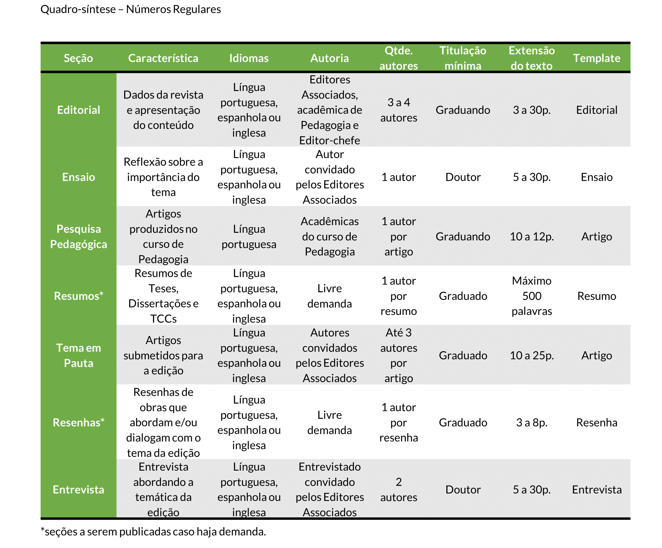 A partir de 2023, os Números Regulares passam a compreender as seguintes seções: I. Expediente e apresentação da edição; II. Ensaio; III. Pesquisa Pedagógica; IV. Resumos; V. Tema em Pauta; VI. Resenhas e VII. Entrevista, quais sejam: